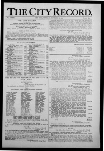The City Record newspaper publishes notices which includes but is not limited to: public hearings and meetings, public auctions and sales, solicitations and awards and official rules proposed and adopted by city agencies. This is the City Record Newspaper for September 28, 1905 with supplement.