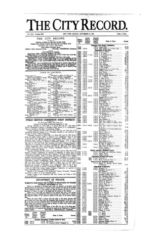The City Record newspaper publishes notices which includes but is not limited to: public hearings and meetings, public auctions and sales, solicitations and awards and official rules proposed and adopted by city agencies. This is the City Record Newspaper for September 21, 1914.
