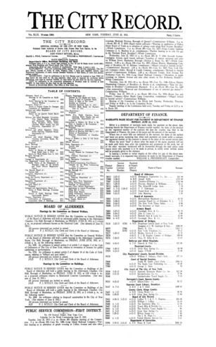 The City Record newspaper publishes notices which includes but is not limited to: public hearings and meetings, public auctions and sales, solicitations and awards and official rules proposed and adopted by city agencies. This is the City Record Newspaper for June 22, 1915.