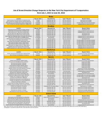 List of Street Direction Change Requests to the New York City Department of Transportation from July 1, 2021 to June 30, 2022