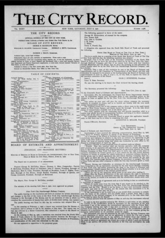 The City Record newspaper publishes notices which includes but is not limited to: public hearings and meetings, public auctions and sales, solicitations and awards and official rules proposed and adopted by city agencies. This is the City Record Newspaper for July 06, 1907.
