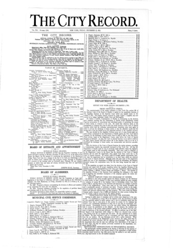 The City Record newspaper publishes notices which includes but is not limited to: public hearings and meetings, public auctions and sales, solicitations and awards and official rules proposed and adopted by city agencies. This is the City Record Newspaper for December 12, 1913 with supplement.