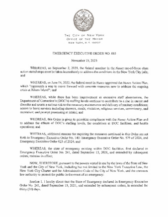 Emergency Executive Order No. 885, is being submitted to extend Emergency Executive Order No. 883, dated November 14, 2025; for five (5) days as it relates to Rikers.