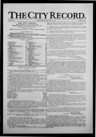 The City Record newspaper publishes notices which includes but is not limited to: public hearings and meetings, public auctions and sales, solicitations and awards and official rules proposed and adopted by city agencies. This is the City Record Newspaper for May 15, 1903.