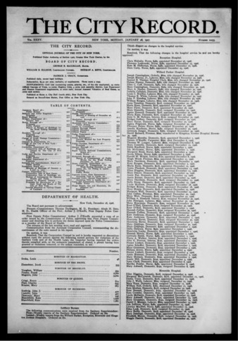 The City Record newspaper publishes notices which includes but is not limited to: public hearings and meetings, public auctions and sales, solicitations and awards and official rules proposed and adopted by city agencies. This is the City Record Newspaper for January 28, 1907.