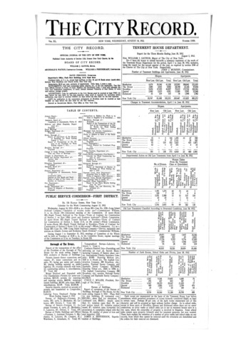 The City Record newspaper publishes notices which includes but is not limited to: public hearings and meetings, public auctions and sales, solicitations and awards and official rules proposed and adopted by city agencies. This is the City Record Newspaper for August 14, 1912.