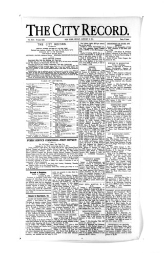 The City Record newspaper publishes notices which includes but is not limited to: public hearings and meetings, public auctions and sales, solicitations and awards and official rules proposed and adopted by city agencies. This is the City Record Newspaper for January 09, 1914 with supplement.