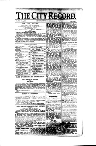 The City Record newspaper publishes notices which includes but is not limited to: public hearings and meetings, public auctions and sales, solicitations and awards and official rules proposed and adopted by city agencies. This is the City Record Newspaper for September 30, 1914.