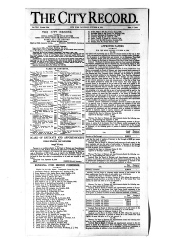 The City Record newspaper publishes notices which includes but is not limited to: public hearings and meetings, public auctions and sales, solicitations and awards and official rules proposed and adopted by city agencies. This is the City Record Newspaper for October 24, 1914.