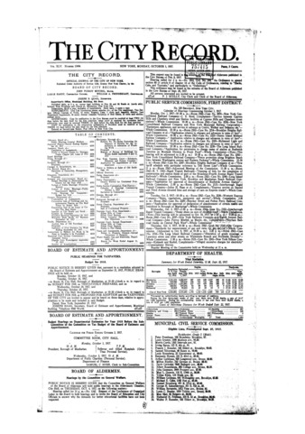 The City Record newspaper publishes notices which includes but is not limited to: public hearings and meetings, public auctions and sales, solicitations and awards and official rules proposed and adopted by city agencies. This is the City Record Newspaper for October 01, 1917.