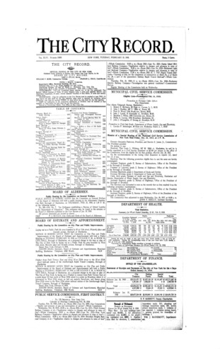 The City Record newspaper publishes notices which includes but is not limited to: public hearings and meetings, public auctions and sales, solicitations and awards and official rules proposed and adopted by city agencies. This is the City Record Newspaper for February 19, 1918.