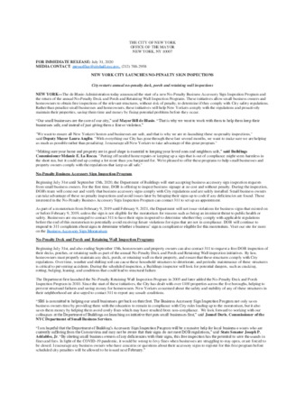 Mayor's Press Release: NEW YORK CITY LAUNCHES NO-PENALTY SIGN INSPECTIONS