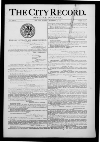 The City Record newspaper publishes notices which includes but is not limited to: public hearings and meetings, public auctions and sales, solicitations and awards and official rules proposed and adopted by city agencies. This is the City Record Newspaper for September 29, 1900.