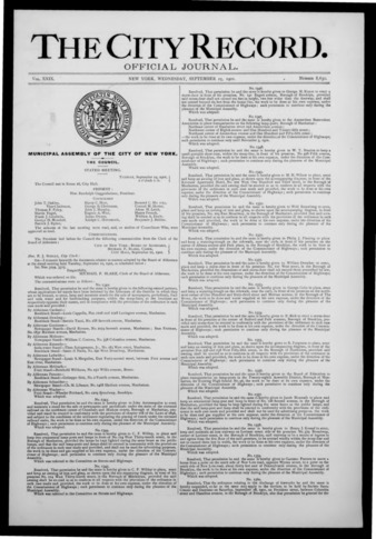 The City Record newspaper publishes notices which includes but is not limited to: public hearings and meetings, public auctions and sales, solicitations and awards and official rules proposed and adopted by city agencies. This is the City Record Newspaper for September 25, 1901.
