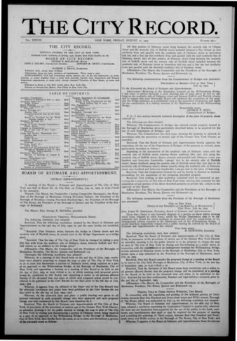 The City Record newspaper publishes notices which includes but is not limited to: public hearings and meetings, public auctions and sales, solicitations and awards and official rules proposed and adopted by city agencies. This is the City Record Newspaper for August 11, 1905.