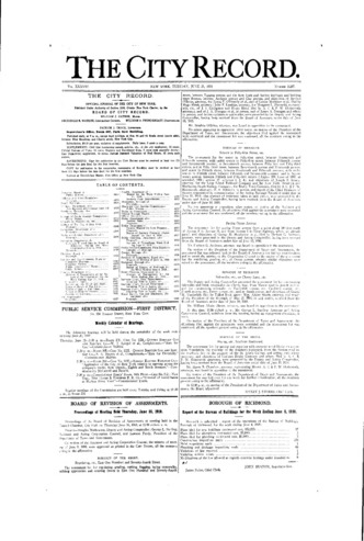 The City Record newspaper publishes notices which includes but is not limited to: public hearings and meetings, public auctions and sales, solicitations and awards and official rules proposed and adopted by city agencies. This is the City Record Newspaper for June 21, 1910.