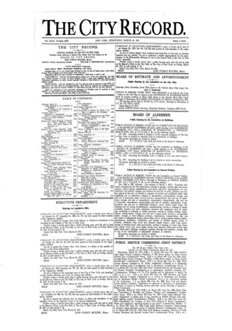 The City Record newspaper publishes notices which includes but is not limited to: public hearings and meetings, public auctions and sales, solicitations and awards and official rules proposed and adopted by city agencies. This is the City Record Newspaper for March 24, 1915.