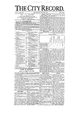 The City Record newspaper publishes notices which includes but is not limited to: public hearings and meetings, public auctions and sales, solicitations and awards and official rules proposed and adopted by city agencies. This is the City Record Newspaper for November 03, 1916.