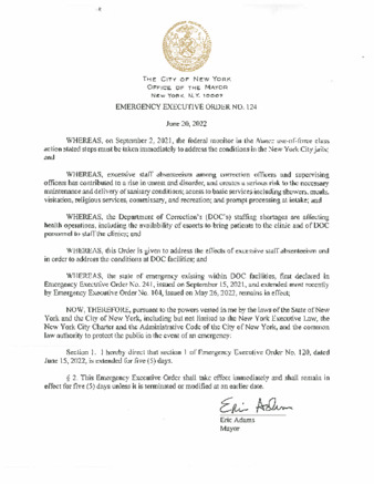 Emergency Executive Order No. 124, extends Emergency Executive Order No. 120, dated June 15, 2022, for five (5) days if this relates to Rikers.