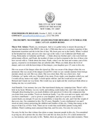 TRANSCRIPT: MAYOR ERIC ADAMS DELIVERS REMARKS AT FUNERAL FOR EMS CAPTAIN ALISON RUSSO