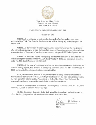 Emergency Executive Order No. 755 is being submitted to extend Emergency Executive Order No. 752, for five (5) days, as it relates to the state of emergency based on the arrival of thousands of individuals and families seeking asylum.