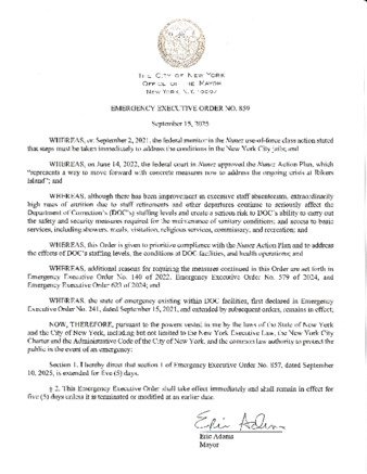Emergency Executive Order No. 859, is being submitted to extend Emergency Executive Order No. 857, dated September 10, 2025; for five (5) days as it relates to Rikers.