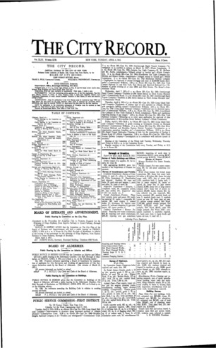 The City Record newspaper publishes notices which includes but is not limited to: public hearings and meetings, public auctions and sales, solicitations and awards and official rules proposed and adopted by city agencies. This is the City Record Newspaper for April 06, 1915.
