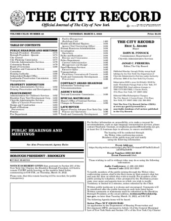 The City Record newspaper publishes notices which includes but is not limited to: public hearings and meetings, public auctions and sales, solicitations and awards and official rules proposed and adopted by city agencies.
