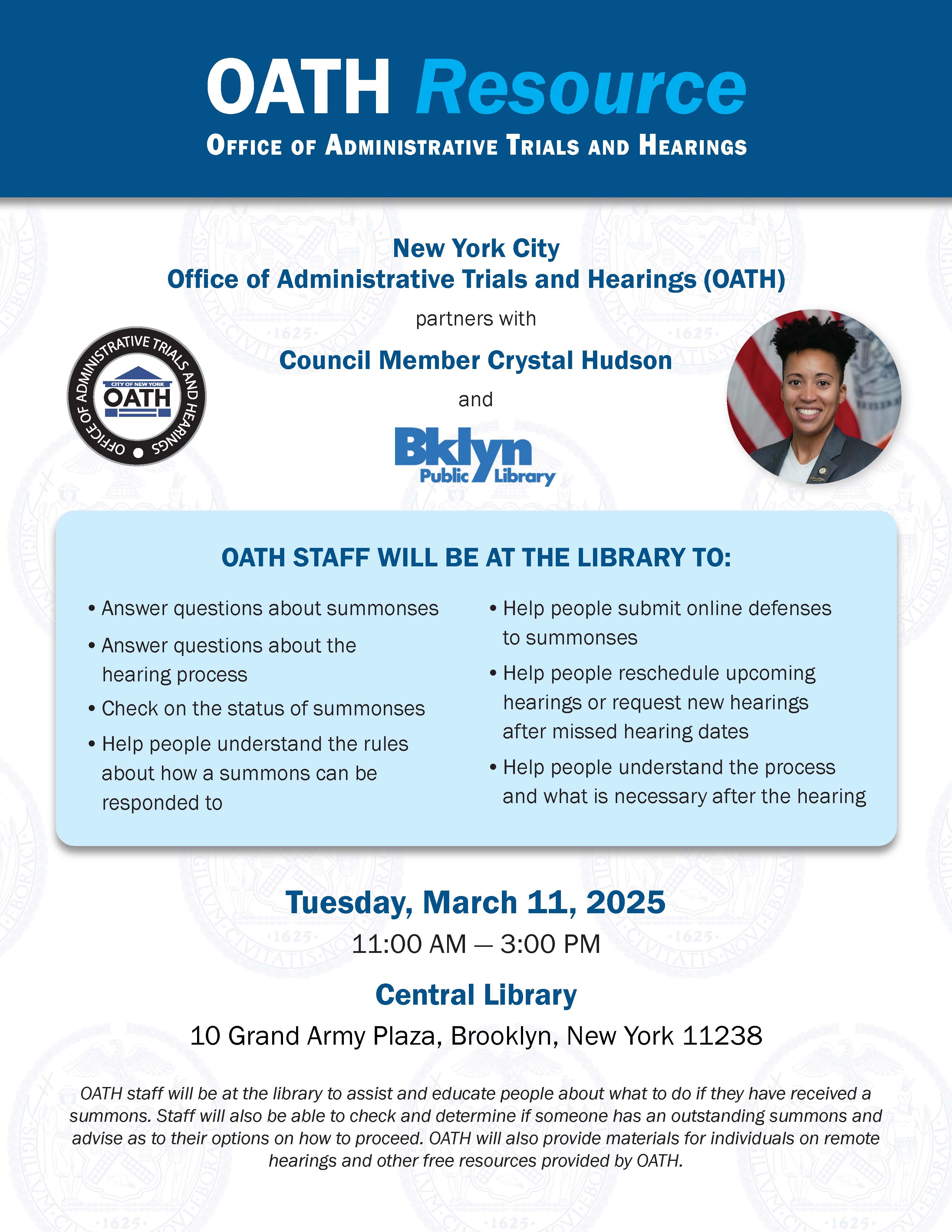 OATH staff were at the library to assist and educate people about what to do should they have received a summons and to check to determine if someone has an outstanding summons. Materials about remote hearings and other free resources were provided to the public as well.