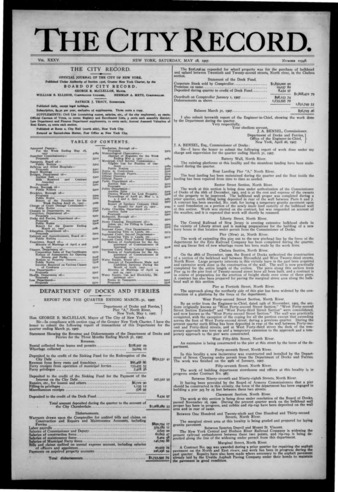 The City Record newspaper publishes notices which includes but is not limited to: public hearings and meetings, public auctions and sales, solicitations and awards and official rules proposed and adopted by city agencies. This is the City Record Newspaper for May 18, 1907.