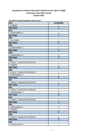 Pursuant to Admin Code Sect. 14-150(d), this monthly report contains information on complaints and arrests for violent felony offenses, assault, sex offenses, disorderly conduct, harassment, aggravated harassment, and offenses against public sensibilities that occurred in transit