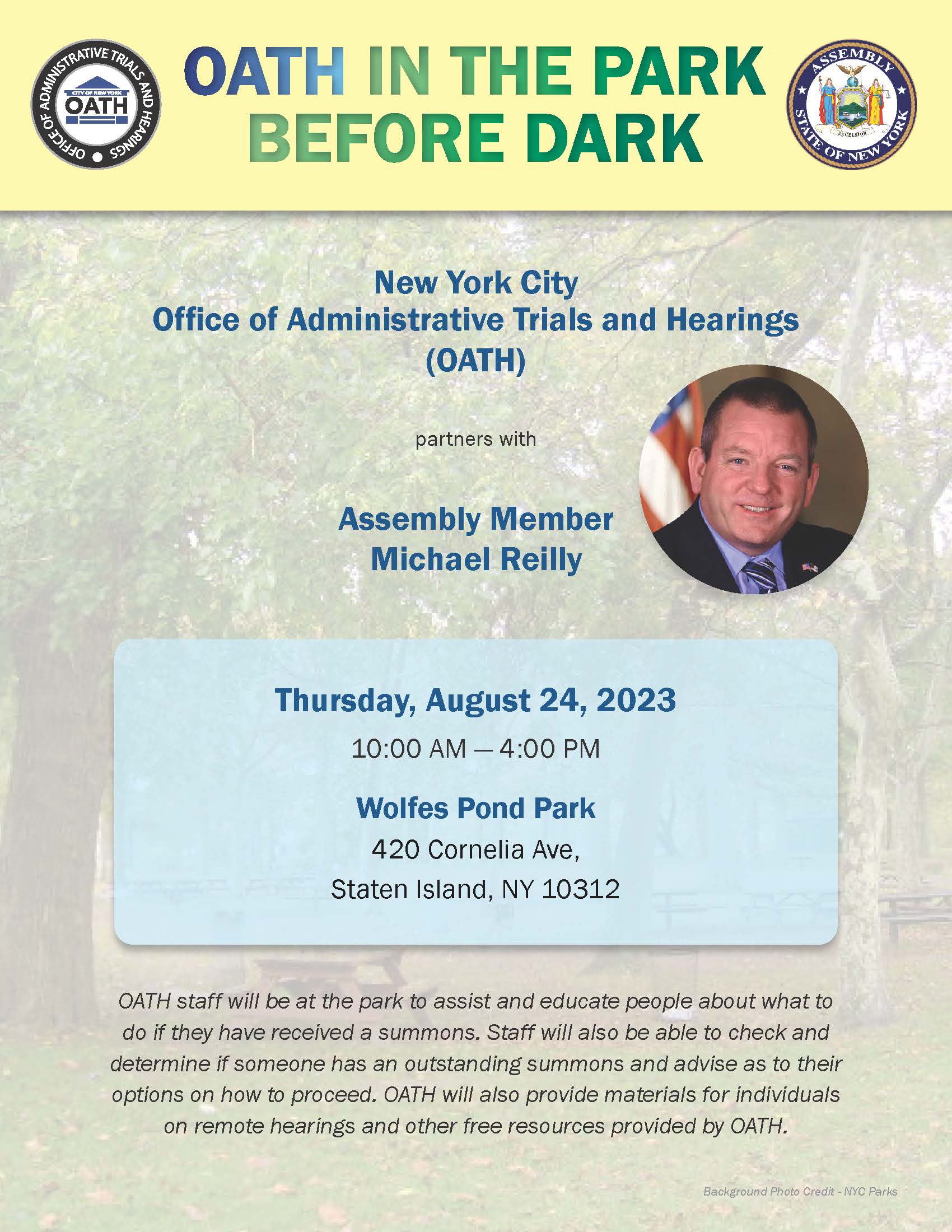 OATH staff were at the park to assist and educate individuals about what to do should they have received a summons and to check to determine if someone has an outstanding summons. Materials about remote hearings and other free resources were provided to the public as well.