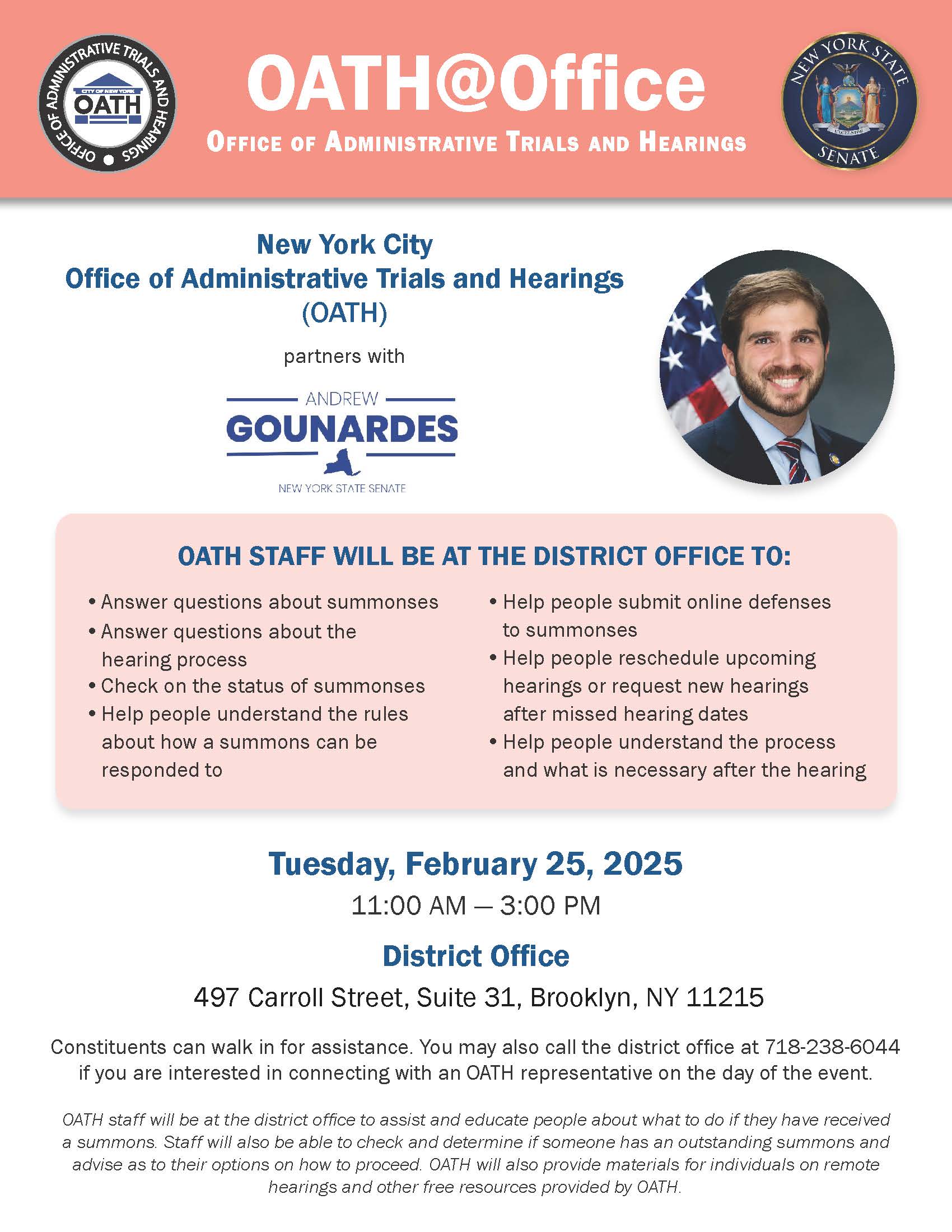 OATH staff were at the district office to assist and educate people about what to do should they have received a summons and to check to determine if someone has an outstanding summons. Materials about remote hearings and other free resources were provided to the public as well.
