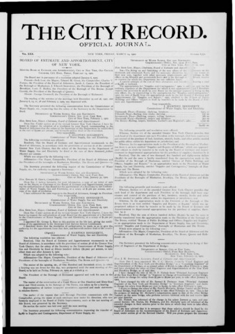 The City Record newspaper publishes notices which includes but is not limited to: public hearings and meetings, public auctions and sales, solicitations and awards and official rules proposed and adopted by city agencies. This is the City Record Newspaper for March 14, 1902.