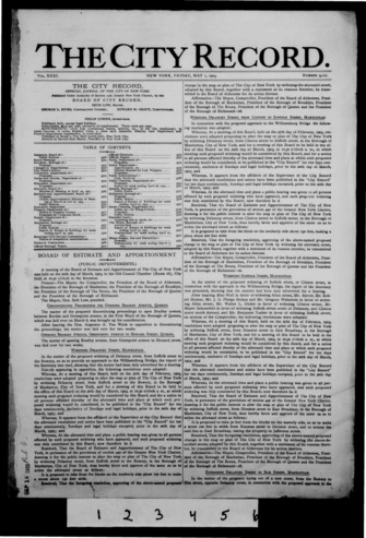 The City Record newspaper publishes notices which includes but is not limited to: public hearings and meetings, public auctions and sales, solicitations and awards and official rules proposed and adopted by city agencies. This is the City Record Newspaper for May 01, 1903.