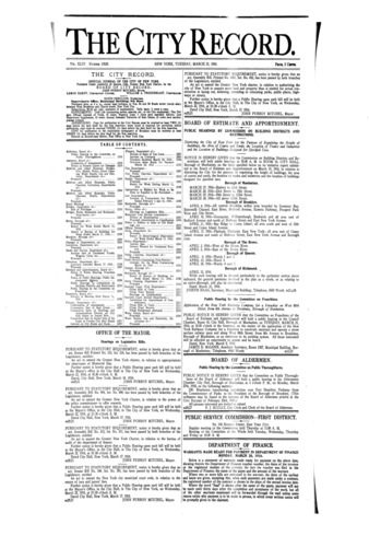 The City Record newspaper publishes notices which includes but is not limited to: public hearings and meetings, public auctions and sales, solicitations and awards and official rules proposed and adopted by city agencies. This is the City Record Newspaper for March 21, 1916.