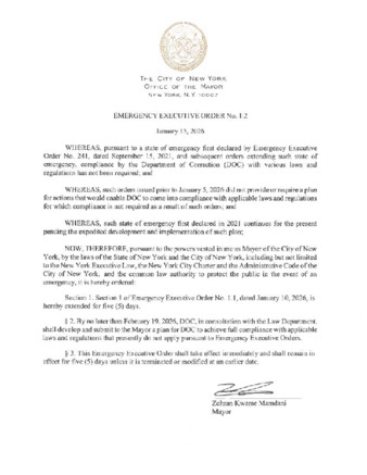 Emergency Executive Order No. 1.2 is being submitted as it relates to Emergency Executive Order No. 1.1 dated January 10, 2026, and will be extended for five (5) days, as it relates to the Department of Correction.