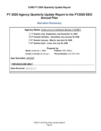 Fiscal Year 2026 Quarter 2 Report outlining the NYC Conflicts of Interest Board’s progress in implementing the goals of its annual Diversity and EEO Plan and participation in training classes to develop agency staff in the areas of equal employment, diversity, civil rights, inclusion, etc.