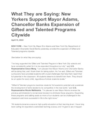 What They are Saying: New Yorkers Support Mayor Adams, Chancellor Banks Expansion of Gifted and Talented Programs Citywide