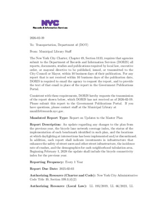 An update regarding any changes to the plan from the previous year, the bicycle lane network coverage index, the status of the implementation of each benchmark identified in such plan, and the locations at which daylighting at intersections has been implemented and/or discontinued. In addition, each report shall indicate investments in infrastructure that enhances the safety of street users and other street infrastructure, the incidence rate of crashes, and the demographics for each neighborhood tabulation area. Beginning February 1, 2028 the update shall include the bicycle connectivity index for the previous year.