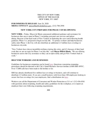 Mayor's Press Release: NEW YORK CITY PREPARES FOR PHASE 3 OF RE-OPENING