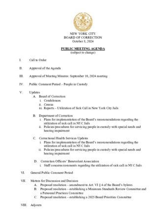 I. Call to Order II. Approval of the Agenda III. Approval of Meeting Minutes: September 10, 2024 meeting IV. Public Comment Period – People in Custody V. Updates VI. General Public Comment Period VII. Matters for Discussion and Decision VIII. Adjourn