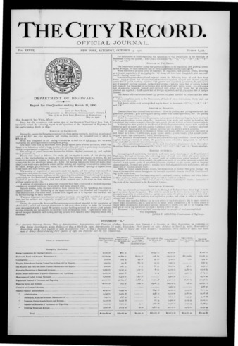 The City Record newspaper publishes notices which includes but is not limited to: public hearings and meetings, public auctions and sales, solicitations and awards and official rules proposed and adopted by city agencies. This is the City Record Newspaper for October 13, 1900.