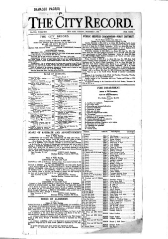 The City Record newspaper publishes notices which includes but is not limited to: public hearings and meetings, public auctions and sales, solicitations and awards and official rules proposed and adopted by city agencies. This is the City Record Newspaper for December 01, 1914.