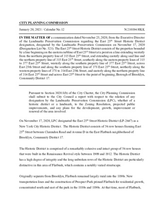 IN THE MATTER OF a communication dated November 25, 2020, from the Executive Director of the Landmarks Preservation Commission regarding the East 25th Street Historic District designation, designated by the Landmarks Preservation Commission on November 17, 2020 (Designation List No. 521). etc