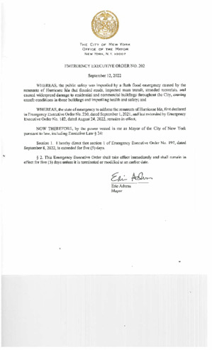 Emergency Executive Order No. 202, extends Emergency Executive Order No. 197, dated September 8, 2022, for five (5) days, if this relates to Hurricane Ida.