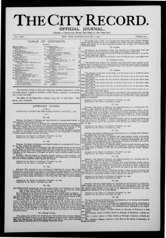 The City Record newspaper publishes notices which includes but is not limited to: public hearings and meetings, public auctions and sales, solicitations and awards and official rules proposed and adopted by city agencies. This is the City Record Newspaper for January 05, 1903.