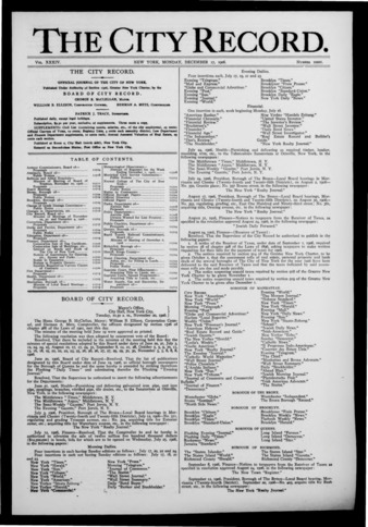 The City Record newspaper publishes notices which includes but is not limited to: public hearings and meetings, public auctions and sales, solicitations and awards and official rules proposed and adopted by city agencies. This is the City Record Newspaper for December 17, 1906.