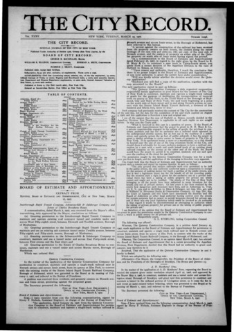 The City Record newspaper publishes notices which includes but is not limited to: public hearings and meetings, public auctions and sales, solicitations and awards and official rules proposed and adopted by city agencies. This is the City Record Newspaper for March 19, 1907.