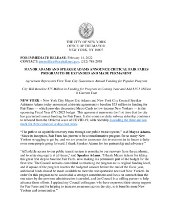 New York City Mayor Eric Adams and New York City Council Speaker Adrienne Adams tannounces a historic agreement to baseline $75 million in funding for Fair Fares in the upcoming Fiscal Year 2023 budget.